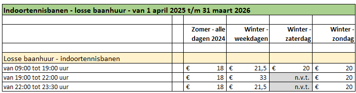 Onderstaand zijn de prijzen voor het huren van een indoor tennisbaan weergegeven.
