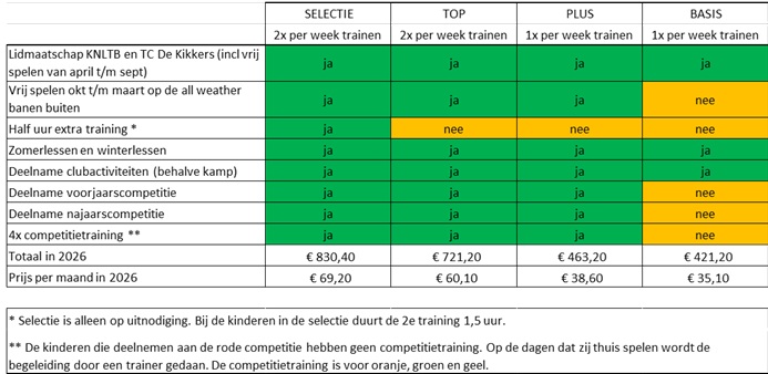 TC De Kikkers biedt vier verschillende pakketten voor junioren aan: